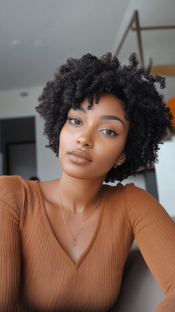 A woman with a neatly trimmed mini afro, showcasing soft and natural curls.